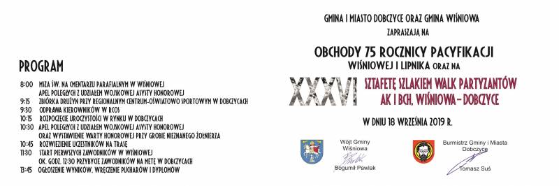 Komitet Organizacyjny XXXVI Sztafety Szlakiem Walk Partyzantów AK i BCh, pod Patronatem Honorowym Witolda Kozłowskiego, Marszałka Województwa Małopolskiego, serdecznie zaprasza reprezentacje szkół podstawowych i średnich z powiatu myślenickiego i zaprzyjaźnionych powiatów, reprezentacje innych organizacji (w tym służb mundurowych) oraz indywidualnych biegaczy do udziału w kolejnym biegu sztafetowym, który odbędzie się 18 września 2019 roku, na trasie: Wiśniowa – Dobczyce. Do udziału w uroczystościach patriotycznych w Wiśniowej i Dobczycach, zapraszamy wszystkich mieszkańców powiatu.