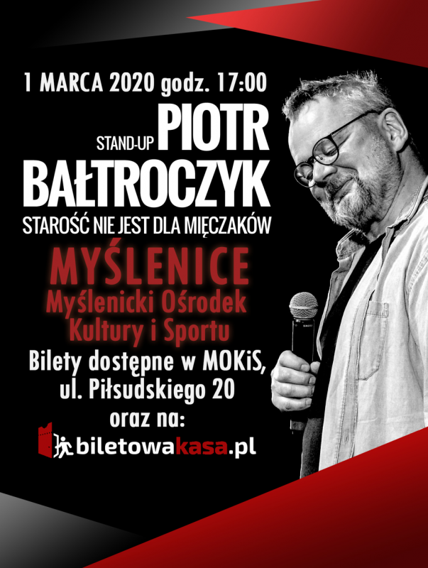 Serdecznie zapraszamy na Stand-up Piotra Bałtroczyka zatytułowany ,,Starość nie jest dla mięczaków’’, który odbędzie się 1 marca 2020 roku o godzinie 17:00 w Myślenickim Ośrodku Kultury i Sportu. Bilety dostępne w kasie MOKIS oraz na stronie internetowej: biletowakasa.pl