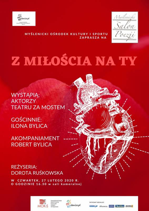 Serdecznie zapraszamy na kolejną edycję myślenickiego Salonu Poezji zatytułowany ,, Z miłością na Ty’’. Wystąpią aktorzy teatru ,,Za mostem”. Przedstawią wiersze o miłości, takich poetów jak: Wiesława Szymborska, Halina Poświatowska, Adam Mickiewicz, Konstanty Ildefons Gałczyński.
