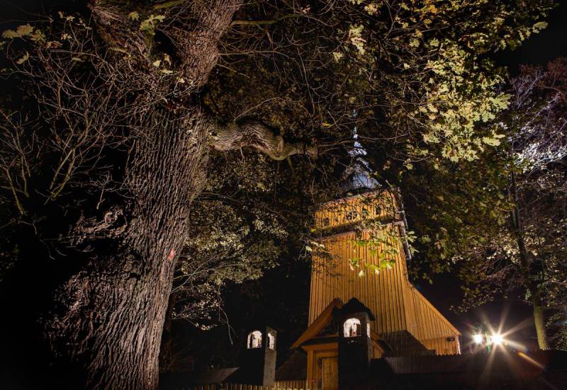 Okazały, pomnikowy dąb, którego wiek szacowany jest na 500 lat, rośnie obok kościoła. To największe i najstarsze z drzew rosnących na terenie dawnego przykościelnego cmentarza, z którego pozostało tylko kilka epitafiów w ścianie kościoła.