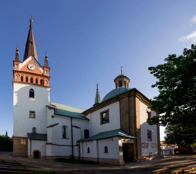 Wznoszący się na zachód od rynku kościół parafialny jest już drugą świątynią stojącą w tym miejscu. Pierwsza powstała w okresie lokacji Myślenic, czyli między 1342 a 1354 r., z fundacji kasztelana krakowskiego Spytka z Melsztyna. Została jednak zburzona w 1457 r. przy okazji walk między zbuntowanymi wojskami zaciężnymi a lojalnymi oddziałami królewskimi. Nową świątynię wzniesiono po 1465 r. W 1543 r. dobudowano renesansową wieżę, podwyższoną na początku ubiegłego wieku o dwa piętra i obecny, neogotycki hełm. Sylwetka kościoła zachowała charakter gotycki ze szkarpami wspierającymi mury nawy i prezbiterium, między którymi przebito wąskie, wysokie okna. Gotycki charakter mają też trzy portale. Wnętrze świątyni przykrywa sklepienie kolebkowe z lunetami z 1790 r. Wystrój reprezentuje głównie styl barokowy. Do świątyni prócz zakrystii przylegają dwie kaplice. Od północy Antoni Oboński ufundował w 1794 r. kaplicę Pana Jezusa. Od południa do kościoła dobudowana jest kwadratowa, nakryta kopułą kaplica MB ufundowana przez hetmana wielkiego koronnego Stanisława Koniecpolskiego w latach 1642–46 jako wotum za przywrócenie wzroku jego synowi Aleksandrowi. W ołtarzu kaplicy umieszczono obraz MB Myślenickiej, namalowany przed 1590 r. w stylu późnego renesansu włoskiego, będący własnością papieża Sykstusa V. W 1596 r. obraz trafił do Polski, od 1633 r. znajduje się się w myślenickim kościele, po zbudowaniu kaplicy został zaś umieszczony w jej głównym ołtarzu.