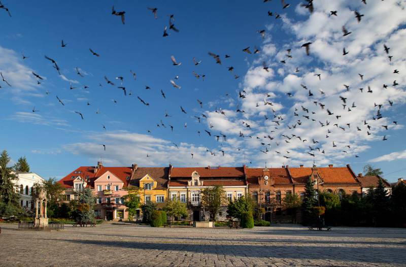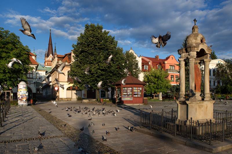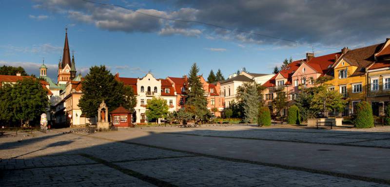 Myślenicki rynek, który do dziś pozostaje sercem miasta, był ośrodkiem średniowiecznego miasta lokacyjnego. Wytyczony został między 1342 a 1354 r. na planie zbliżonym do prostokąta z pierzejami o długości od 90 do 120 m. Przylegające kwartały, podzielone na wąskie działki, oddzielone były ulicami – pierwotnie z każdego narożnika rynku wychodziły po dwie ulice. Oryginalny układ urbanistyczny zaburzyło wytyczenie z nakazu władz austriackich w 1784 r. tzw. traktu cesarskiego. Powstała wówczas obecna ul. M. Reja, wychodząca ze środka pierzei wschodniej. Nie wiadomo natomiast dokładnie, kiedy zostały zabudowane i znikły ulice wychodzące niegdyś z pierzei wschodniej na południe i na północ. Dziś na placu stoją tylko: studnia Tereska, kapliczka ze św. Florianem oraz Pomnik Niepodległości, ale dawniej wznosił się na środku rynku browar oraz kuźnia, które w połowie XVIII w. zostały zastąpione zajazdem – zburzonym z kolei w połowie następnego wieku. Zabudowa pierzei wokół rynku niegdyś była niemal wyłącznie drewniana i często trawiły ją katastrofalne pożary. Dlatego najstarsze zachowane do dziś domy pochodzą dopiero z końca XVIII w. Niektóre zachowały charakter późnobarokowo-klasycystyczny, m.in. kamienice nr 10, 23 i 27. Zachowały się w nich sklepienia kolebkowe z lunetami. Pod nr. 8-9 stoi gmach ratusza z lat 1895–99 projektu znanego architekta Jana Sas-Zubrzyckiego. Podobnie jak wiele innych budynków jego projektu, także i myślenicki ratusz ma ceglaną, nieotynkowaną fasadę z zegarem i herbem miasta.