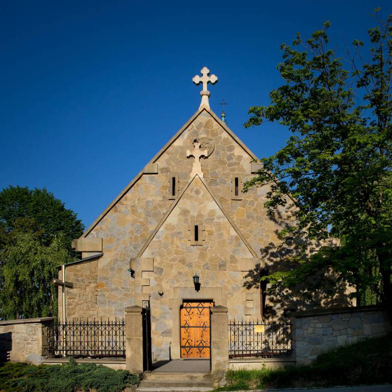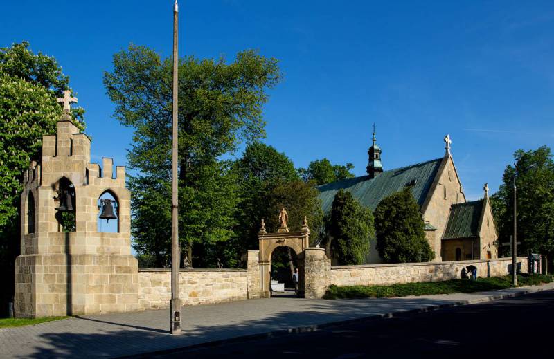 Późnogotycki kościół filialny pw. św. Jakuba na Stradomiu stoi w miejscu, gdzie zapewne powstał pierwszy myślenicki kościół parafialny – drewniany pw. NMP. Istniał on na pewno w 1325 r., kiedy umieszczono go w spisach tzw. świętopietrza. W 1480 r. odnotował istnienie drewnianego kościoła także Jan Długosz, jednak już wkrótce potem, przed końcem XV w., powstał późnogotycki kościół murowany. Zniszczony w okresie „potopu” przez Szwedów, został wkrótce potem odbudowany. Władze austriackie zamknęły świątynię, przeznaczając ją na potrzeby wojskowego magazynu, a potem planowały jej rozbiórkę. Jednak niszczejący budynek kupił mieszczanin Jan Traczowski, przeprowadził jego remont i w 1815 r. podarował miastu. Wtedy też kościół otrzymał obecne wezwanie. Pod koniec XIX w. zmieniono sklepienie, dodano dzwonnicę oraz kruchtę wg projektu Stanisława Odrzywolskiego, który nadał im charakter neogotycki. Wyposażenie wnętrza kościoła reprezentuje głównie barok. Rozciągający się obok cmentarz założono na początku XIX w. Znajdują się tu mogiły zasłużonych obywateli miasta, legionistów Piłsudskiego oraz kwatera żołnierzy polskich poległych w walkach z Niemcami podczas kampanii wrześniowej 1939 r. Na cmentarzu pochowano również czerwonoarmistów, poległych z kolei zimą 1945 r. w okolicy Myślenic. Do północnej nawy kościoła przylega grób Nieznanego Żołnierza z 1925 r., do którego dodano płytę upamiętniającą 120 mieszkańców Myślenic – ofiary niemieckiego terroru czasów okupacji 1939–45.