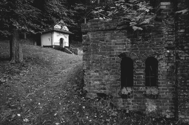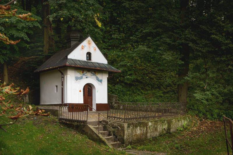 Późnobarokowa kapliczka powstała pod koniec XVIII w. przy źródle obficie bijącym u stóp wschodnich stoków Plebańskiej Góry. Mieszkańcy Myślenic od dawna wierzyli w uzdrawiającą moc wody ze źródła, co znalazło swój wyraz właśnie w budowie kaplicy. Podobno w tym miejscu w XIII w. istniała pierwotna osada, z której wyrosły Myślenice, a jej ośrodkiem był stojący tu rzekomo drewniany kościółek, dopiero w XV w. odbudowany na Stradomiu (w miejscu obecnego kościoła pw. św. Jakuba). Kaplica, odnawiana w 1866 i 1879 r., udekorowana jest wewnątrz malowidłami Sebastiana Stolarskiego. Widać na nich scenę cudownego uzdrowienia dzięki wodzie ze źródła oraz przeniesienie obrazu MB Myślenickiej do kościoła parafialnego z domu Marcina Grabyszy w 1633 r. Sportretowano tu również mieszczan myślenickich, fundatorów remontów kaplicy. Samo źródło w 1892 r. zostało ujęte. Wodę z niego poprowadzono rurociągiem do rynku, gdzie zasiliło fontannę Tereskę.