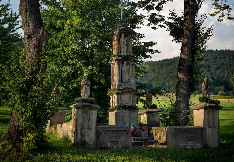 Niezwykła w formie kapliczka stoi pod trzema okazałymi drzewami tuż przy głównej drodze od kościoła w Jasienicy w kierunku przełęczy Szklary. Wykonana z piaskowca, ma centralny, dość typowy słup z kilkoma coraz węższymi piętrami. Na każdym umieszczono z czterech stron płaskorzeźbione wizerunki świętych – od frontu widać Pana Jezusa po raz trzeci upadającego pod krzyżem, św. Annę oraz MB Różańcową z Dzieciątkiem. Nad całością góruje umieszczony na szczycie metalowy ażurowy krzyż. O niezwykłości kapliczki, pochodzącej zgodnie z tablicą fundacyjną z 1876 r. (fundatorami byli Tomasz i Zofia Łojkowie), decyduje otaczający ją kamienny murek, rozwiązanie zupełnie niespotykane w regionie. W narożnikach murku na wyższych słupkach widnieją płaskorzeźby świętych w płytkich niszach, a wieńczą je figury kolejnych świętych. Między słupkami, oprócz części frontowej, rozciągnięto metalowe pręty.