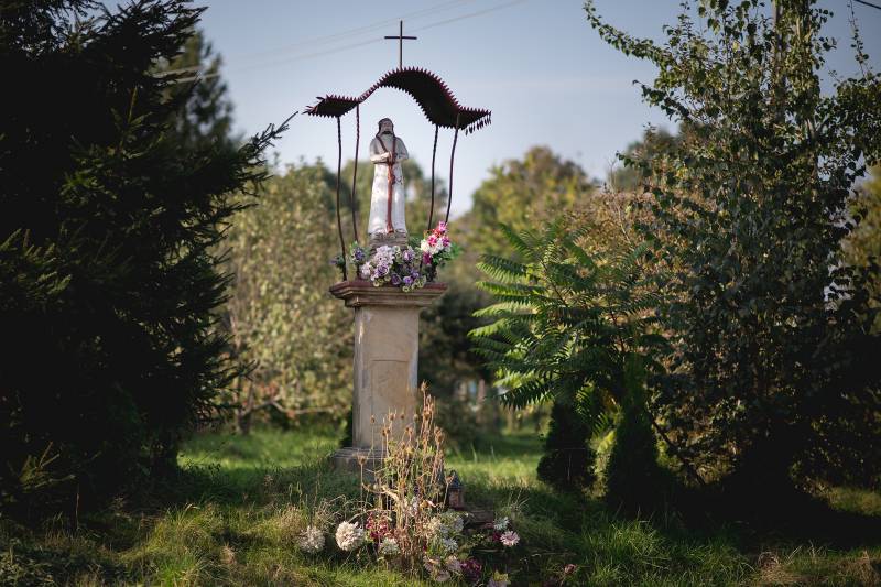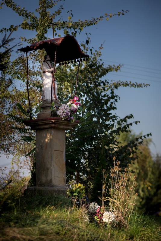 Niewielka filarowa kapliczka stoi na skarpie ponad skrzyżowaniem szosy z Myślenic z boczną drogą do zachodniej części Polanki. Na kwadratowym cokole umieszczono wysoki, smukły piaskowcowy postument. Brak na nim inskrypcji – być może znajdowała się ona w płycinie na froncie postumentu, jednak dziś jest zupełnie zatarta. Postument wieńczy bardzo szeroki, profilowany gzyms. Wyżej ustawiono jeszcze jeden profilowany cokolik piaskowcowy, a dopiero na nim ustawiona jest polichromowana figura Pana Jezusa w koronie cierniowej i ze związanymi rękami oraz szkaplerzem na piersiach. Figura osłonięta jest blaszanym, faliście wygiętym daszkiem zwieńczonym krzyżem.