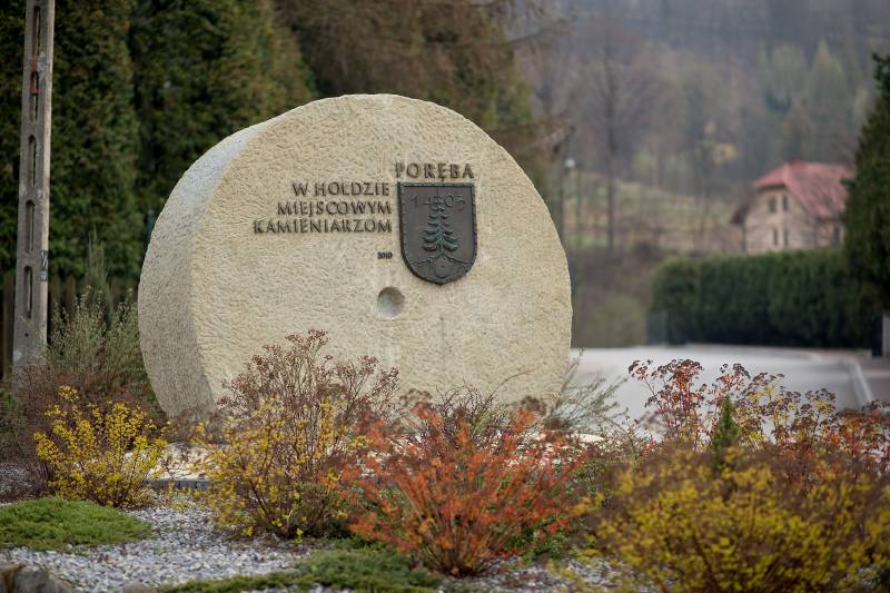 W Porębie aż do końca II wojny światowej działały liczne warsztaty kamieniarskie, które najczęściej surowiec czerpały z kamieniołomów na zboczach Kamiennika. Miejscowi majstrowie kamieniarscy wyrabiali przede wszystkim kamienie młyńskie – dlatego też upamiętniający ich pomnik w centrum Poręby to właśnie ustawiony na sztorc, stylizowany piaskowcowy kamień młyński, na którym umieszczono inskrypcję: „W hołdzie miejscowym Kamieniarzom – Poręba” oraz herb miejscowości.