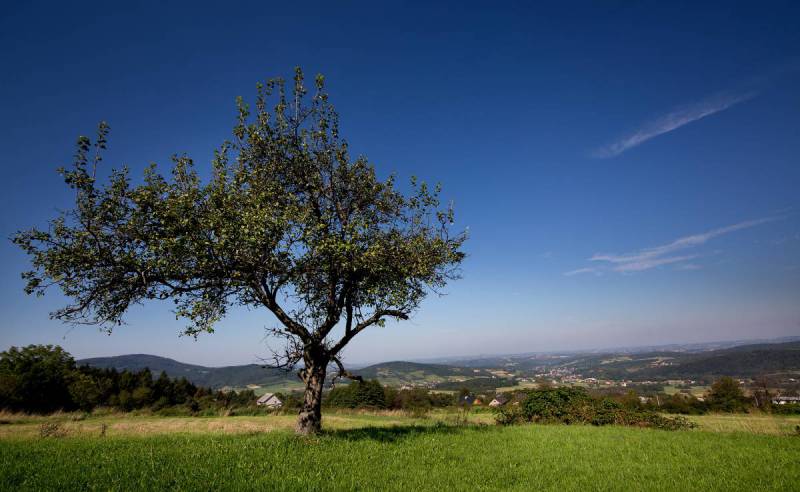 Z pól poniżej krawędzi lasów Kamiennika, pośród rozproszonej zabudowy przysiółka Trzemeśni – Radlanek – rozciąga się widok na szeroką w tym miejscu dolinę Trzemeśnianki, łączącą się z rozległym obniżeniem oddzielającym Beskid Wyspowy (Pasmo Lubomira i Łysiny) od Pogórza Wiśnickiego (Pasmo Glichowca). W obniżeniu tym płynie potok Zasanka i leży wieś Zasań. Prócz jej zabudowań widać również Trzemeśnię i nieco dalej w dół doliny Trzemeśnianki wieś Łęki. Na dalekim planie perspektywę doliny zamykają wznoszące się już po północnej stronie doliny Raby, za Jeziorem Dobczyckim, wzgórza Pogórza Wielickiego, na których leżą Borzęta. Jednak w panoramie dominują pobliskie góry – na prawo, za obniżeniem Przełęczy Zasańskiej, Ostrysz, Trupielec i grzbiet opadający z niego ku lewej (na północny zachód) ku Tulei, zaś za doliną Trzemeśnianki widać charakterystyczną stromą, choć niską Krowią Górę, a następnie znacznie wyższe Grodzisko i Uklejnę.