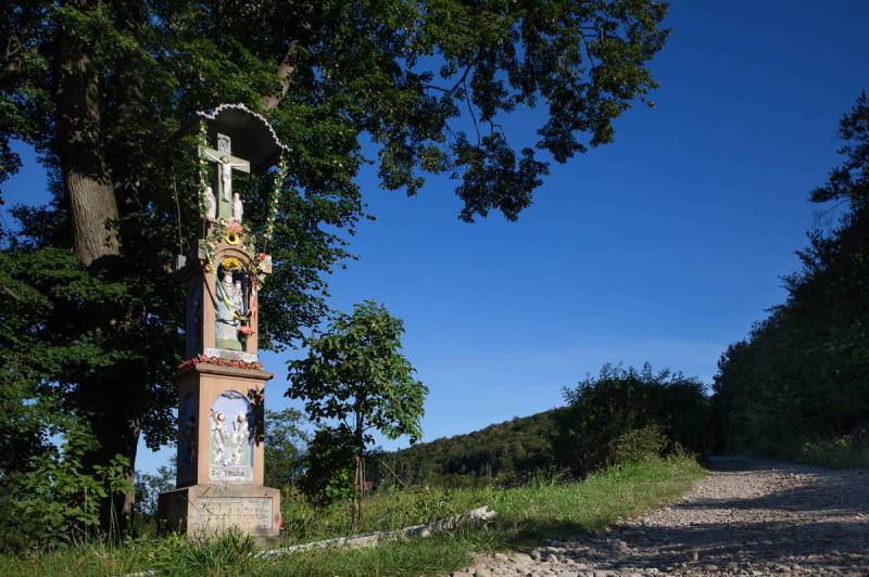 Kamienna przydrożna kapliczka przy starej, bitej drodze wiodącej pod szczytem Trupielca do Kornatki ustawiona jest na kwadratowym cokole z inskrypcją fundacyjną. W dolnej części postumentu znajdują się płaskorzeźbione przedstawienia świętych oraz Trójcy Świętej, umieszczone w arkadkowych niszach. W wyższej, nieco węższej części postumentu również umieszczono płaskorzeźbione postacie świętych – jedynie we frontowej części kapliczki w głębszej niszy stoi figurka MB z Dzieciątkiem. Postument wieńczy profilowany gzyms, nad którym ustawiono wieńczącą kapliczkę grupę Ukrzyżowania. Po dwóch stronach kamiennego krzyża z Ukrzyżowanym stoją Matka Boża i św. Jan. Ukrzyżowanie osłania blaszany, faliście wygięty daszek.