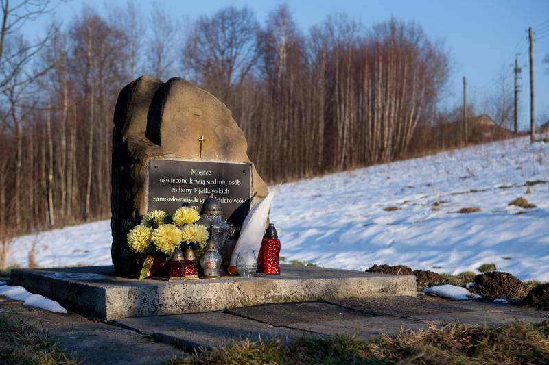 Obelisk upamiętniający akcję odwetową Niemców w Zawadzie, podczas której wymordowano członków rodziny Józefa Fijałkowskiego „Halniaka”, działacza konspiracyjnego z Zawady, dowódcy grupy dywersyjnej współpracującej z działającym na północ od Myślenic oddziałem Kedywu „Błyskawica”. Zebrania grupy Fijałkowskiego odbywały się w strażnicy OSP w Zawadzie. 7 IV 1944 r. Niemcy próbowali rozbić jedno z zebrań, jednak w wyniku strzelaniny raniony został dowódca żandarmerii niemieckiej z Myślenic, a Fijałkowski zdołał zbiec. Z Zawady wyprowadził też do bezpiecznej kryjówki żonę i dzieci. Jednak dwa tygodnie później Niemcy spalili dom Fijałkowskiego i zabili siedem osób z jego rodziny, m.in. rodziców. Od tego momentu Fijałkowski przybrał nowy pseudonim: „Odwet”, niestety jednak zginął 28 V w niejasnych okolicznościach, być może zastrzelony przez kolegę – zdrajcę – z własnego oddziału.
