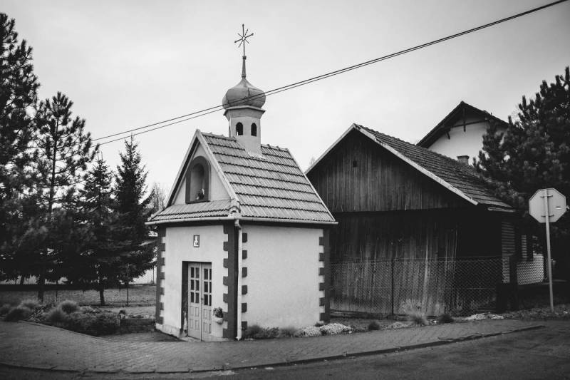 Kapliczka domkowa stoi tuż przy szosie do Sułkowic na skraju wsi. Niewielka, murowana, ma zaznaczone boniowaniem narożniki oraz dwuspadowy dach okapowy, kryty dachówką. Na jego kalenicy umieszczono wieżyczkę z sygnaturką, zwieńczoną obitym blachą cebulastym hełmem z krzyżem. W półkoliście zamkniętej niszy w szczycie kapliczki umieszczono figurkę MB. We wnętrzu znajduje się natomiast rzeźba Pana Jezusa upadającego pod krzyżem po raz trzeci oraz obraz MB Harbutowickiej. Data budowy kapliczki to 1809 r. Po II wojnie światowej w kapliczce odbywały się odpusty ku czci MB Różańcowej, a od 1967 r. w okresie wakacji przyjeżdżał tu ksiądz z parafii w Sułkowicach, by sprawować liturgię świętą.