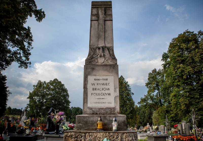 Pomnik, poświęcony pamięci poległych w okresie I wojny światowej Sieprawian, znajduje się na terenie cmentarza parafialnego w Sieprawiu. Wzniesiony po I wojnie światowej zgodnie z inskrypcją: „W pamięć braciom Poległym”, został odnowiony w 1992 r. Ma postać kamiennego obelisku na wysokim cokole. Na górnej części obelisku stoi prosty płaskorzeźbiony krzyż, pod którym tuż nad tablicą inskrypcyjną widnieje orzeł, umieszczony na tle rozwianych sztandarów i trzymający w szponach ryngraf z literami RP. Jak można sądzić, orzeł pierwotnie miał koronę na głowie, najwyraźniej skutą po II wojnie światowej.