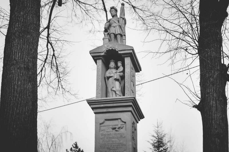 Kapliczka św. Floriana, stojąca pod dwoma okazałymi lipami, pochodzi, zgodnie z inskrypcją fundacyjną, z 1871 r. Stojąca na szczycie kapliczki kamienna postać św. Floriana jest typowa dla przedstawień tego świętego. Święty ustawiony jest na dwuspadowym daszku wieńczącym postument. Daszek z Okiem Opatrzności osłania wyższe piętro postumentu, w którym w głębokiej niszy za szybą ustawiono polichromowany posąg MB Różańcowej z Dzieciątkiem na ręku. Matka i mały Jezus mają korony na głowach i trzymają w rękach różaniec. W dolnym piętrze postumentu, pod profilowanym gzymsem, widać płaskorzeźbę z przedstawieniem sceny Trzeciego Upadku Pana Jezusa pod krzyżem oraz tablicę fundacyjną – fundatorami byli Wojciech i Kunegunda Włodarczykowie. Również po bokach na postumencie można zobaczyć przedstawienia świętych – po lewej św. Kunegundy i Trójcy Świętej, a po prawej zapewne św. Wojciecha i św. Barbarę.
