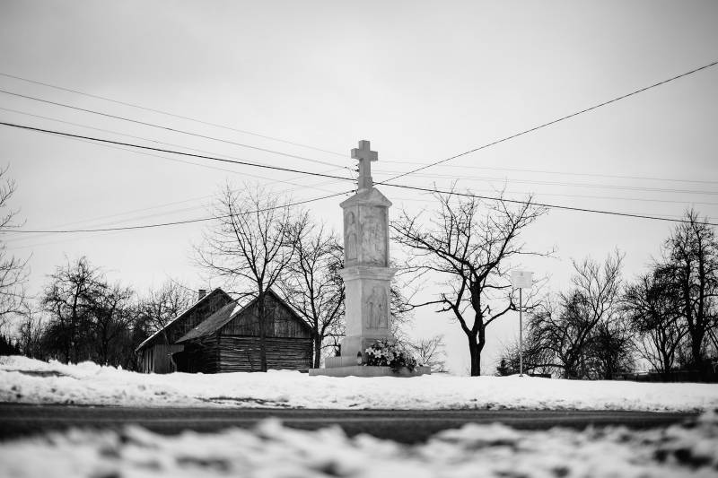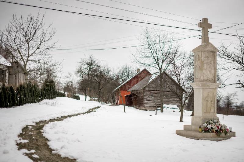 Skryta częściowo za szpalerem świerków rosnących wzdłuż granicy prywatnej posesji, przydrożna kapliczka ma postać wysokiego kamiennego postumentu, zwieńczonego krzyżem. Krzyż ustawiony jest na dwuspadowym daszku ponad wyższą kondygnacją postumentu. Widnieje w niej w płytkiej niszy mocno zatarte płaskorzeźbione przedstawienie sceny Ukoronowania NMP. Widać jeszcze wyraźnie Ducha Świętego, przedstawionego w górnej części kompozycji, na środku, pod postacią gołębicy. Poniżej widać Chrystusa z krzyżem wspartym na ramieniu, a z przeciwnej strony Boga Ojca – obaj trzymają koronę nad głową Maryi. Z postaci Boga Ojca i Maryi zachowały się właściwie tylko głowy. W dolnej części postumentu, poniżej profilowanego gzymsu, widnieje płaskorzeźbione przedstawienie – być może jest to św. Anna z małą Matką Boską. Na samym dole umieszczono wciąż czytelną tablicę fundacyjną z datą fundacji (1876 r.) oraz nazwiskami fundatorów, tj. Mikołaja i Agaty Oramusów.