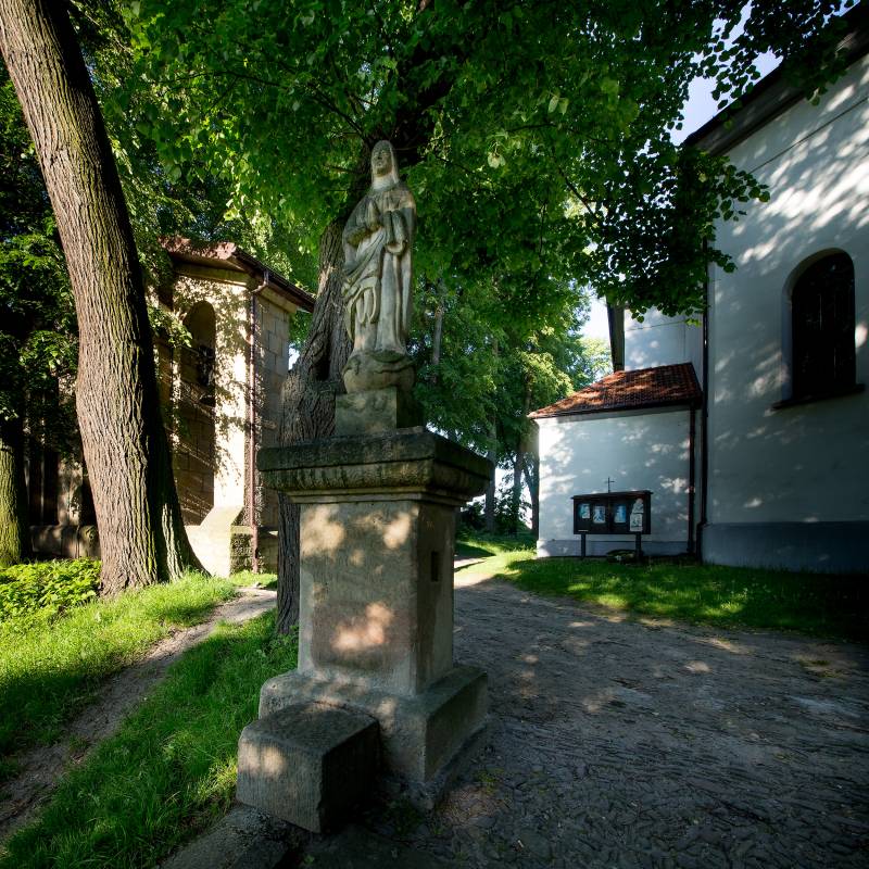 Stojące u szczytu kamiennych schodów posągi MB Niepokalanie Poczętej i św. Jana Nepomucena stały pierwotnie przy moście nad Rabą. W czasie II wojny światowej zostały strącone do wody przez okupacyjne władze niemieckie. Zostały jednak wydobyte z rzeki i ukryte. Dopiero w 1970 r. działacze PTTK z Dobczyc ustawili odnalezione figury na obecnym miejscu. Późnobarokowe posągi wykonano z piaskowca. Obie figury pochodzą z 1768 r. Niestety, inskrypcje fundacyjne są całkowicie zatarte.