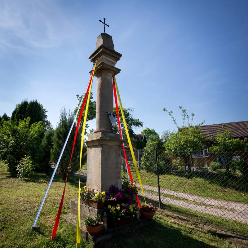 Stojący na prywatnej posesji krzyż to przykład przydrożnej kapliczki słupowej z XVII w. Na kamiennym, trójstopniowym cokole ustawiony jest wysoki piaskowcowy postument, na którym z kolei ustawiono kolumnę pozbawioną głowicy. Zamiast niej bezpośrednio na kolumnie jest profilowany gzyms, a na nim, na mniejszym postumencie, umieszczono niewielki metalowy krzyż. Wyryta w piaskowcu inskrypcja pozwala dowiedzieć się, że fundatorem kapliczki był karczmarz Michał Smolka, a kapliczka miała upamiętniać Mękę Pańską.