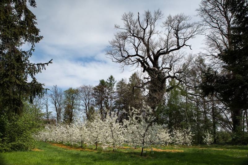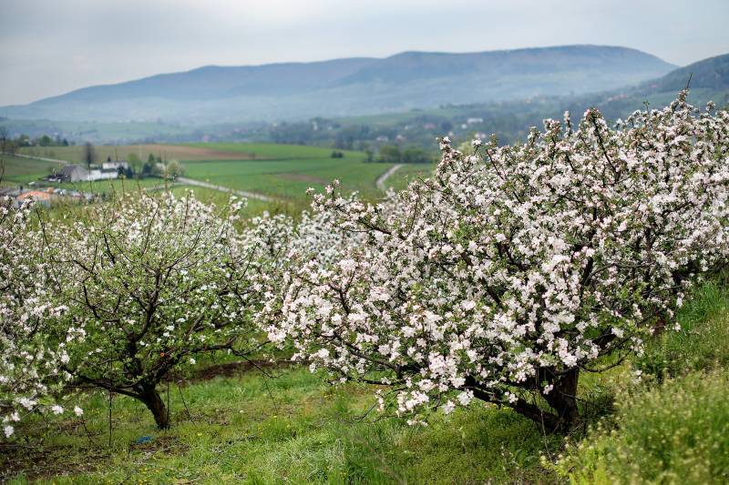 Rozległe sady wokół Komornik, a także wielu okolicznych miejscowości w gminie Raciechowice, to jeden z symboli tych okolic. Uprawia się tu przede wszystkim jabłonie, słynące ze wspaniałych, lokalnych odmian jabłek. Są one wpisane na Listę Produktów Tradycyjnych województwa małopolskiego. Prócz jabłoni sadzono tu wiśnie, grusze oraz morwy. Sadownictwo zaczęło się rozwijać w 1. poł. XIX w. dzięki właścicielom tutejszych folwarków szlacheckich. Jednym z pionierów sadownictwa był w okolicach Raciechowic właściciel majątku Komorniki Julian Finko. W 1830 r. miał on sprowadzić szlachetne drzewka owocowe aż z Królewca. Owoce były stąd wysyłane na rynki Krakowa, ale trafiały również do stolicy monarchii austro-węgierskiej – Wiednia. Szczególnie intensywny rozwój sadownictwa przypadł jednak na lata powojenne i obecnie na terenie gminy Raciechowice jest przeszło 1000 ha sadów.