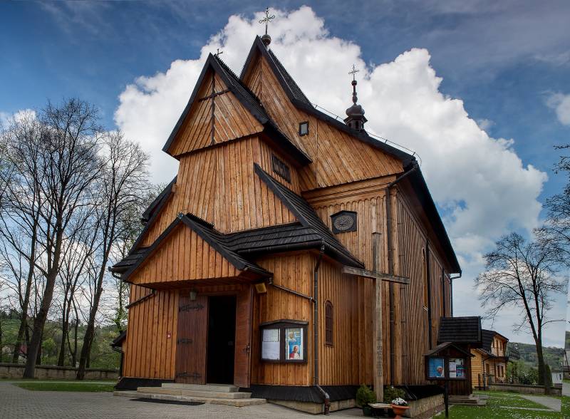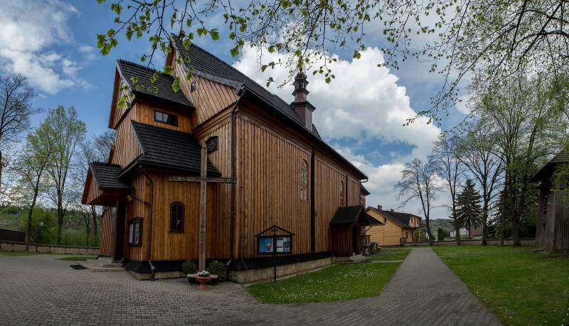 Kościół pw. św. Jakuba Apostoła i św. Katarzyny w Raciechowicach to cenny zabytek architektury drewnianej. Pochodzi z 1720 r. Jest jednonawowy, zbudowany w konstrukcji zrębowej, oszalowany deskami. Dachy pokryte ma gontem. Od strony zachodniej ma dobudowaną kruchtę z pięterkiem pełniącym funkcję dzwonnicy, natomiast do prezbiterium dostawiono kapliczkę z krucyfiksem z XVIII w. Na dachu nawy wznosi się wieżyczka sygnaturki z cebulastym hełmem z latarnią i krzyżem, obitym blachą. Wnętrze świątyni dekorują malowidła z początku ubiegłego wieku. Cennymi zabytkami sztuki są rokokowe elementy wyposażenia z ołtarzami wykonanymi zapewne przez mistrza snycerskiego Piotra Korneckiego, a także z amboną, chrzcielnicą i kropielnicą. W ołtarzach umieszczono obrazy: MB z XVI w. oraz św. Katarzyny Aleksandryjskiej w ołtarzu głównym, a w ołtarzach bocznych wizerunki św. Sebastiana i św. Jakuba oraz Świętej Rodziny i św. Teresy z XVIII w.