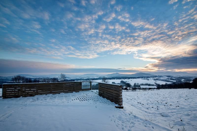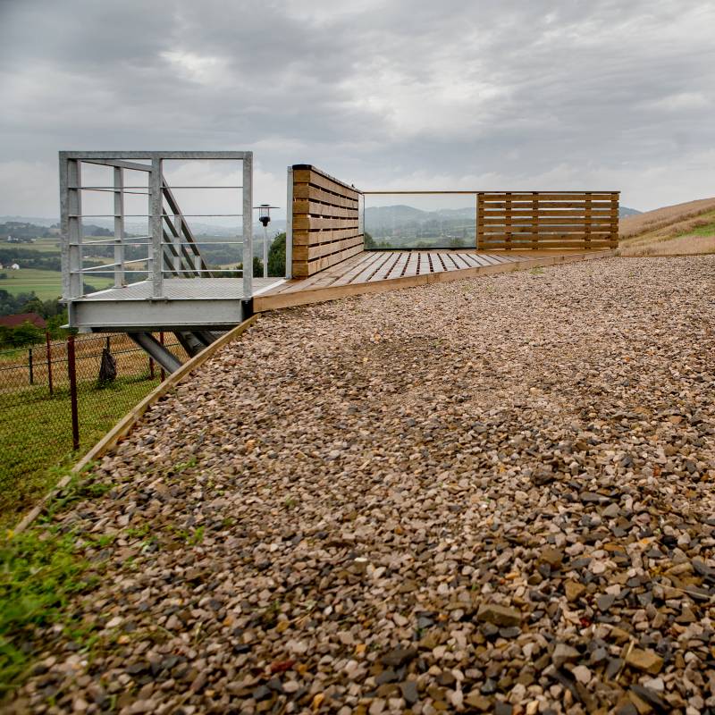 Przy szosie z Raciechowic przez Mierzeń do Łapanowa, w przysiółku Gruszów zwanym Dział, powstał w 2013 r. taras z punktem widokowym i zainstalowaną lunetą obserwacyjną. Widok z tego miejsca, znajdującego się pobliżu kulminacji grzbietu na wysokości ok. 375 m n.p.m., jest bardzo rozległy. Ponad doliną, w której leży centrum Gruszowa, i nad doliną Stradomki wzrok biegnie na południe ponad Wzgórzami Szczyrzyckimi ku szczytom Beskidu Wyspowego – widok obejmuje Śnieżnicę, Mogielicę, Łopień i znacznie bliższe Kostrze, a dalej na południowym wschodzie Kamionną i Pasmo Łososińskie. Na południu niekiedy widać nawet Tatry, zaś na południowym zachodzie panorama zdominowana jest przez Pasmo Cietnia z charakterystycznym, bliskim Grodziskiem, zza którego wyłaniają się szczyty Pasma Lubomira i Łysiny. Blisko na zachodzie widać jeszcze w dużym skrócie pobliskie, niższe Pasmo Glichowca.