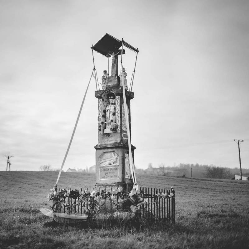 Odrestaurowana niedawno kapliczka filarowa w Kwapince pochodzi z 1879 r. Wzniesiona z kamienia, ustawiona została na dwustopniowym cokole. W dolnej części widnieje płaskorzeźbione przedstawienie Trzeciego Upadku Chrystusa pod krzyżem, wyżej można dostrzec płaskorzeźbiony wizerunek św. Anny. Górne piętro postumentu przeznaczono na stojącą w głębokiej niszy figurkę MB. Ponad nią umieszczono wsparty na dwóch kolumienkach ozdobny gzyms. Szczyt kapliczki wieńczy grupa Ukrzyżowania, w której brakuje jednak zniszczonej figurki św. Jana.