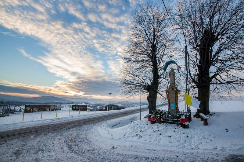 Kamienna, piaskowcowa kapliczka przydrożna o charakterze późnobarokowym z początku XIX w., z figurą MB Różańcowej z Dzieciątkiem na rękach. Obie postacie mają na głowach korony, a Maryja trzyma w rękach różaniec. Figurę osłania metalowy daszek, wsparty na dekoracyjnych prętach naśladujących wijące się pnącza z kwiatami. Matka Boża ustawiona jest na dużym, kamiennym postumencie z wydatnym gzymsem z półkolistą niszą, w której widnieje płaskorzeźbiona muszla. Postument poniżej gzymsu ujęty jest w wolut i ustawiony na kamiennych stopniach.