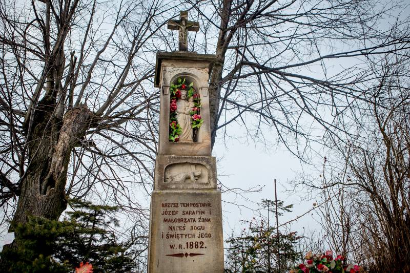 Kamienna kapliczka filarowa z 1882 r. stoi przy głównym skrzyżowaniu dróg w Kwapince, na skraju pól uprawnych. Na szczycie dwukondygnacyjnego postumentu umieszczono grupę Ukrzyżowania: kamienny krzyż z postacią Pana Jezusa, a po bokach krzyża figurki św. Jana i MB. Ukrzyżowanie osłania dwuspadowy daszek blaszany. Poniżej w głębokiej niszy stoi posąg MB z Dzieciątkiem. Poniżej, w dolnej kondygnacji postumentu, jest płaskorzeźbiony wizerunek Trzeciego Upadku Chrystusa. Po bokach postumentu umieszczono w półkoliście zamkniętych niszach wizerunki świętych, każdy z podpisem. Całość stoi na kwadratowym cokole kamiennym.