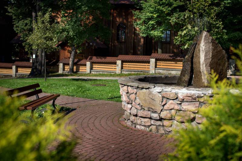 Na placu przed starym, drewnianym kościołem w samym centrum wsi Wiśniowa stanęła niedawno niewielka fontanna. Okrągły, obramowany kamiennym murkiem basen otacza umieszczone centralnie dwa głazy, ponad które wytryskuje strumień wody. Szemrząca cicho woda daje zwłaszcza w gorące dni ochłodę, a placyk wokół fontanny zachęca do chwili wypoczynku.