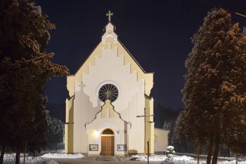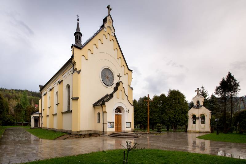Neoromański kościół parafialny pw. NMP Królowej Polski został zbudowany w latach 1906–09. Początkowo miał stanąć na gruncie podarowanym przez księcia Kazimierza Lubomirskiego, ostatecznie jednak znalazł się na innej parceli. Z tego okresu pochodzą również ołtarze we wnętrzu, reprezentują jednak styl neobarokowy. Światło do wnętrza pada poprzez interesujące witraże z 1966 r., wykonane wg projektu Adama Buncha. Do zespołu kościelnego należą ponadto zbudowane w 1908 r. wolno stojąca dzwonnica oraz plebania. Jednak ustanowienie osobnej parafii w Stróży nastąpiło dopiero w 1922 r.; wcześniej, od samego początku istnienia wsi, należała ona do parafii w Myślenicach.